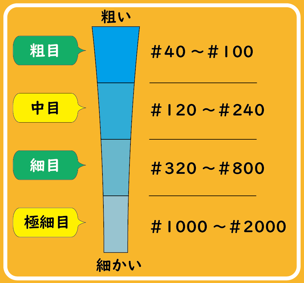 - 粗目:激しい金属のサビ落としや塗装剥がしなど