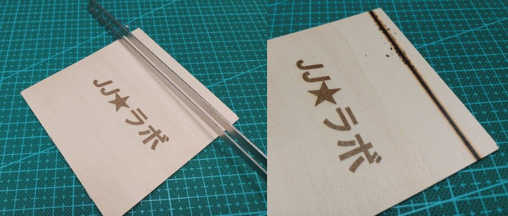 レーザー彫刻機の記事で作った薄い木材ですが、ブレードを当てるだけだと、当たってる部分が焦げるだけで、ブレードを押し引きしてみましたが、焦げが、粉になって出て、刃が立たないといったところです。